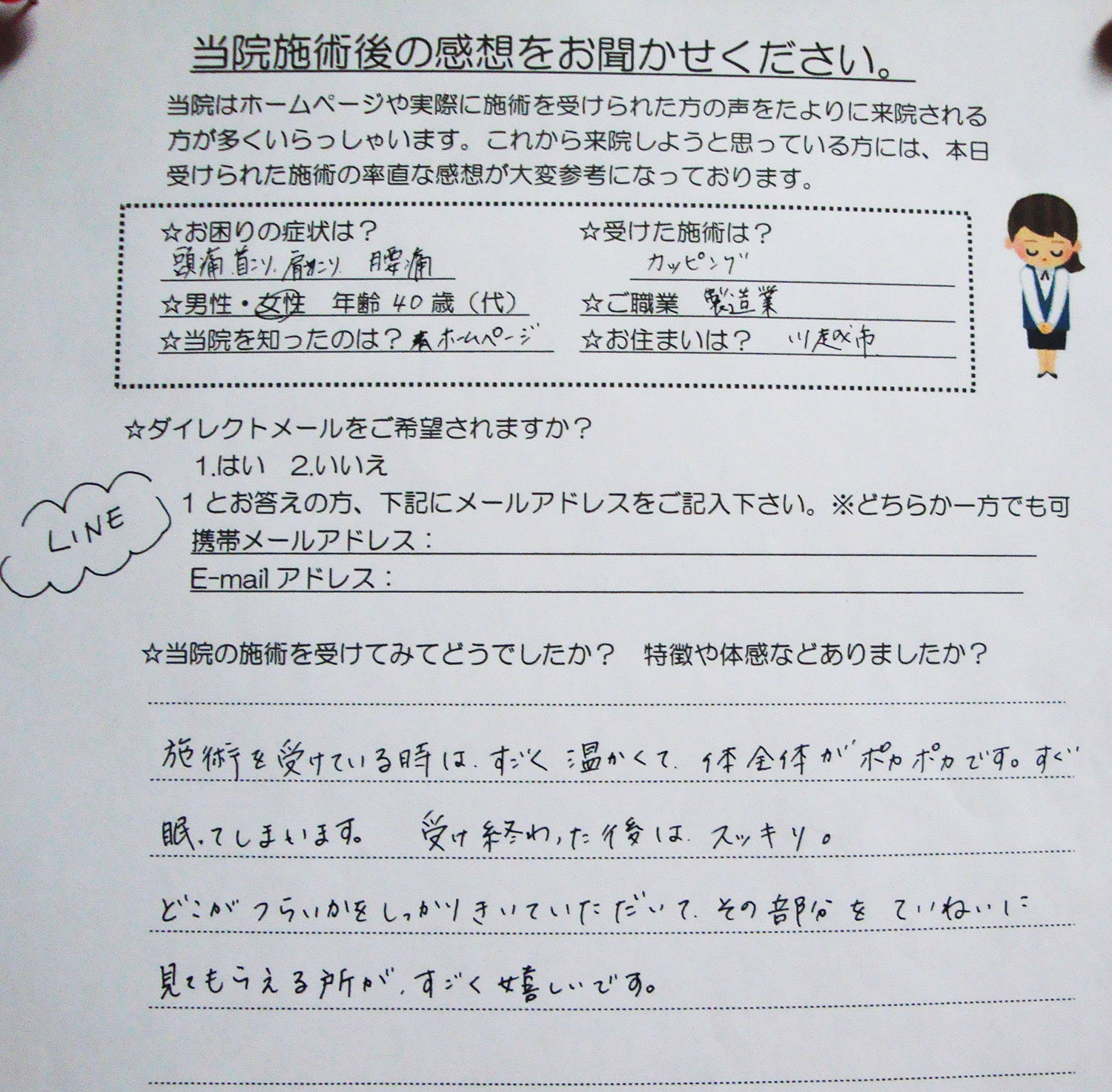 当院施術後のお客様の感想を掲載いたします。
