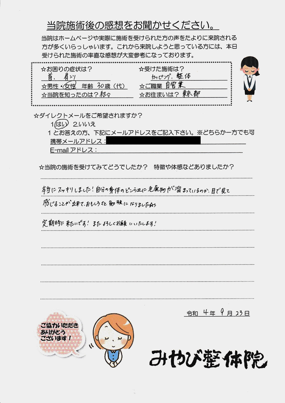 お客様の声 Vol.12 2022.11.4 当院施術後のお客様の感想を掲載いたします。 ◉お困りの症状は? 首、肩こり ◉受けた施術は? カッピング、整体 ◉性別/年齢/ご職業/お住まい 女性/30歳/自営業/東京都 ◉当院の施術を受けてみてどうでしたか?特徴や体感などありましたか? 本当にスッキリしました!自分の身体のどこら辺に老廃物が溜まっているのか、目で見て感じることが出来て、おもしろさと勉強になりました。定期的に来たいです!またよろしくお願いいたします!