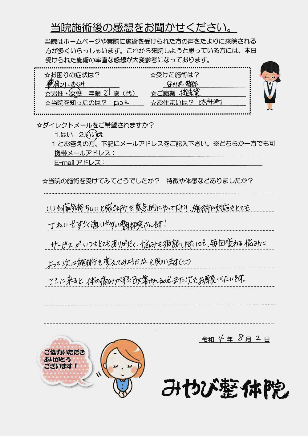 サービスがいつもとてもありがたく、悩みも相談しやすいので、毎回変わる悩みによって次は施術を変えてみようかなと思います。ここに来ると体の痛みがすごく改善されるので、また次もお願いしたいです。