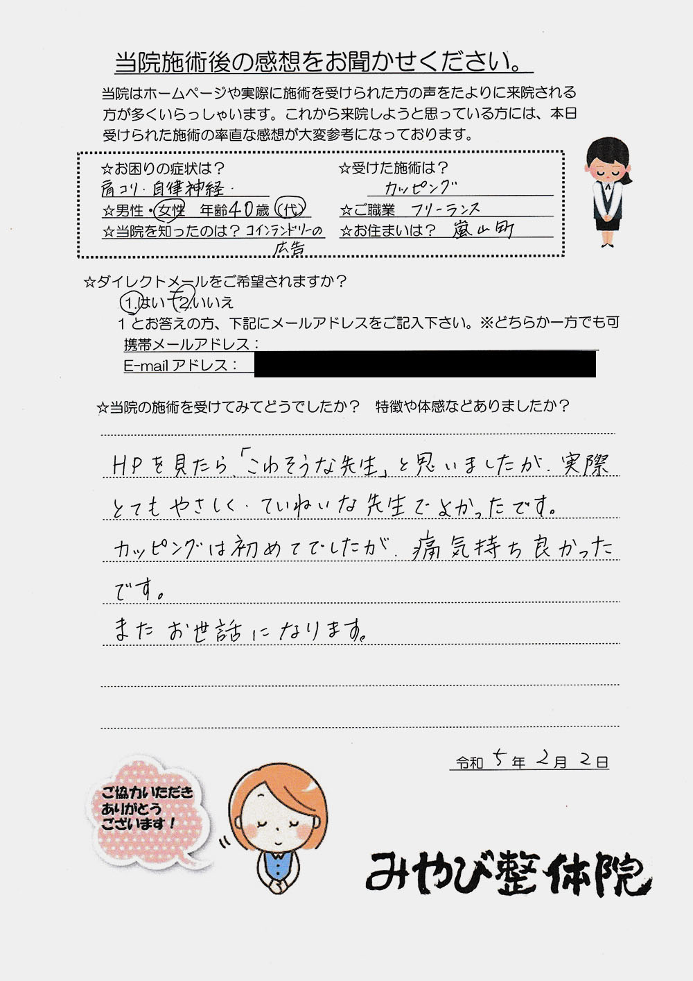 お客様の声 Vol.20 2023.04.16 当院施術後のお客様の感想を掲載いたします。 ◉お困りの症状は? 肩コリ・自律神経 ◉受けた施術は? カッピング ◉性別/年齢/ご職業/お住まい 女性/40歳代/フリーランス/嵐山町 ◉当院の施術を受けてみてどうでしたか?特徴や体感などありましたか? HPを見たら「こわそうな先生」と思いましたが。実際とてもやさしく・ていねいな先生でよかったです。 カッピングは初めてでしたが、痛気持ち良かったです。 またお世話になります。