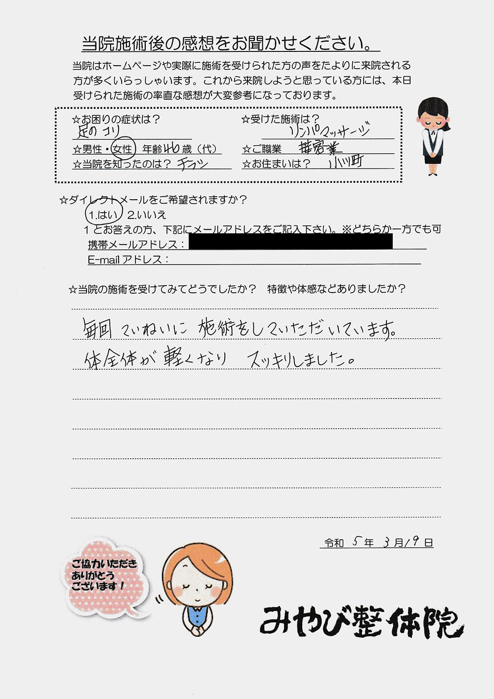 お客様の声 Vol.21 2023.04.16 当院施術後のお客様の感想を掲載いたします。 ◉お困りの症状は? 足のコリ ◉受けた施術は? リンパマッサージ ◉性別/年齢/ご職業/お住まい 女性/46歳/接客業/小川町 ◉当院の施術を受けてみてどうでしたか?特徴や体感などありましたか? 毎回ていねいに施術をしていただいています。 体全体が軽くなりスッキリしました。